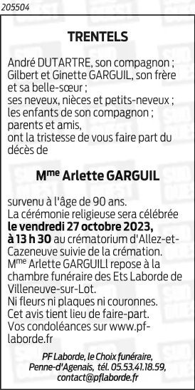 Retrouvez ici l’avis de décès de Arlette GARGUIL et les coordonnées de l’agence de pompes funèbres en charge des obsèques