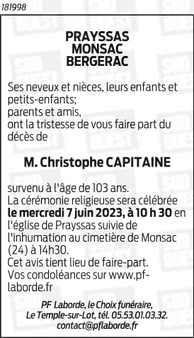 Retrouvez ici l’avis de décès de Christophe CAPITAINE et les coordonnées de l’agence de pompes funèbres en charge des obsèques